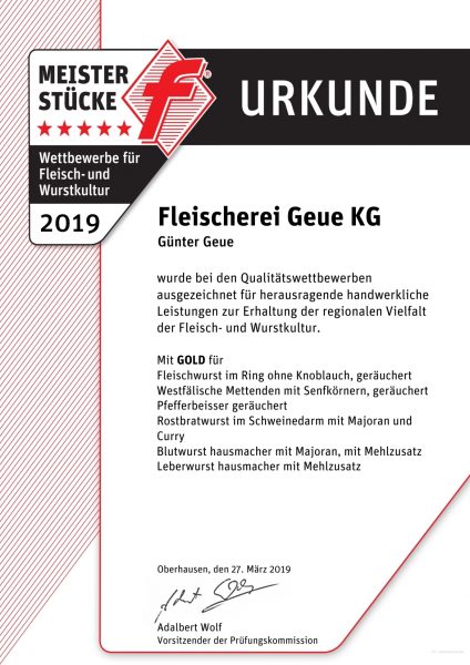 Die Fleischerei Geue aus Hüsten wurde von der Jury der „Meisterstücke – Wettbewerbe für Fleisch- und Wurstkultur“, der Qualitätsprüfung des Fleischerhandwerks für den Erhalt der regionalen Vielfalt bei Fleisch und Wurst, für herausragende Leistungen ausgezeichnet. Mit dieser Auszeichnung hat die Fleischerei Geue ebenfalls das Recht erworben, den Titel „Wir sind bei den Besten“ im Rahmen der „Meisterstücke – Wettbewerbe für Fleisch- und Wurstkultur 2019“ zu führen.