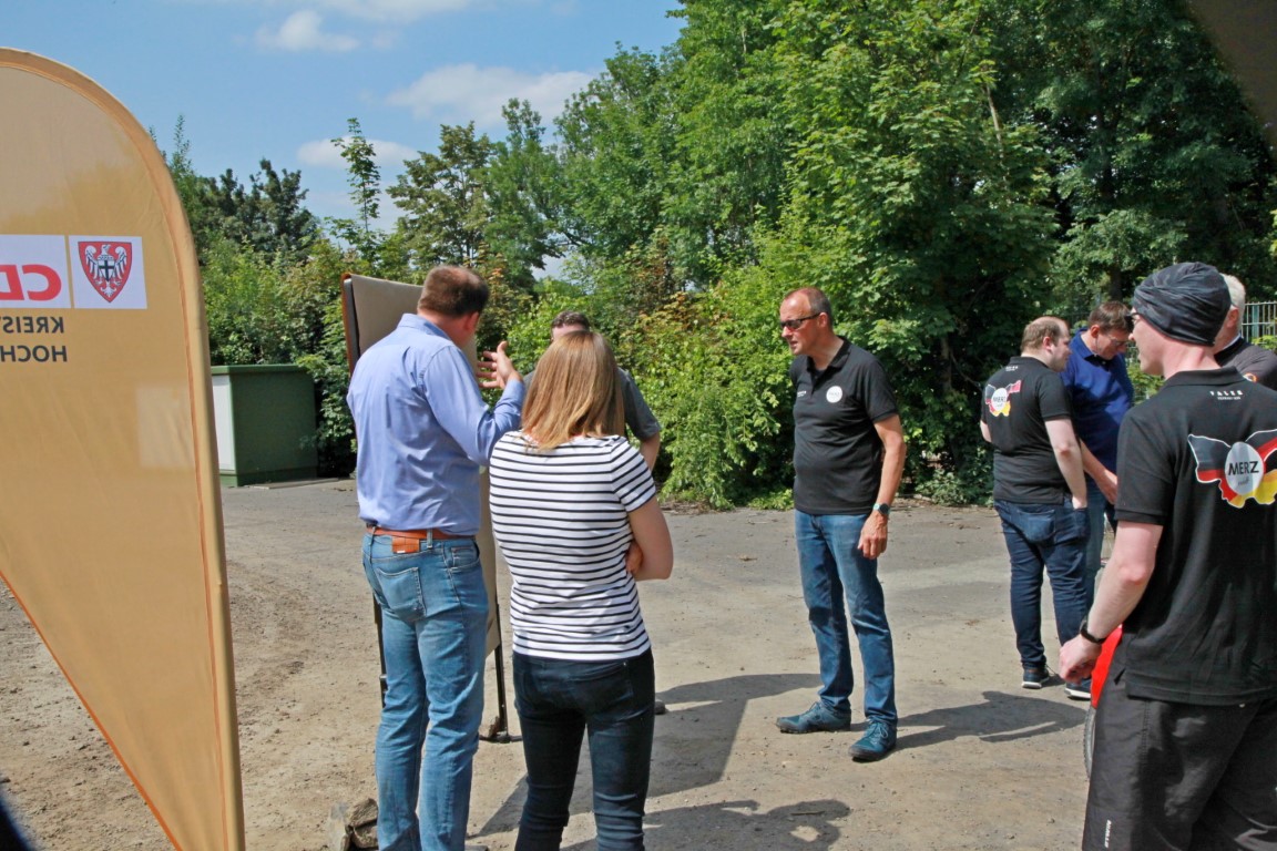 Eine Delegation des CDU Ortsverbandes begrüßte Friedrich Merz und seine Begleitung am neuen Großparkplatz an der Riggenweide. Martin Schulte (Vorsitzender des CDU OV Hüsten), Michael Peters (Mitglied des Rates der Stadt Arnsberg) und Lena Eggenhofer (stellv. Vorsitzende des OV Hüsten) stellten das Konzept für den neuen Parkplatz vor.