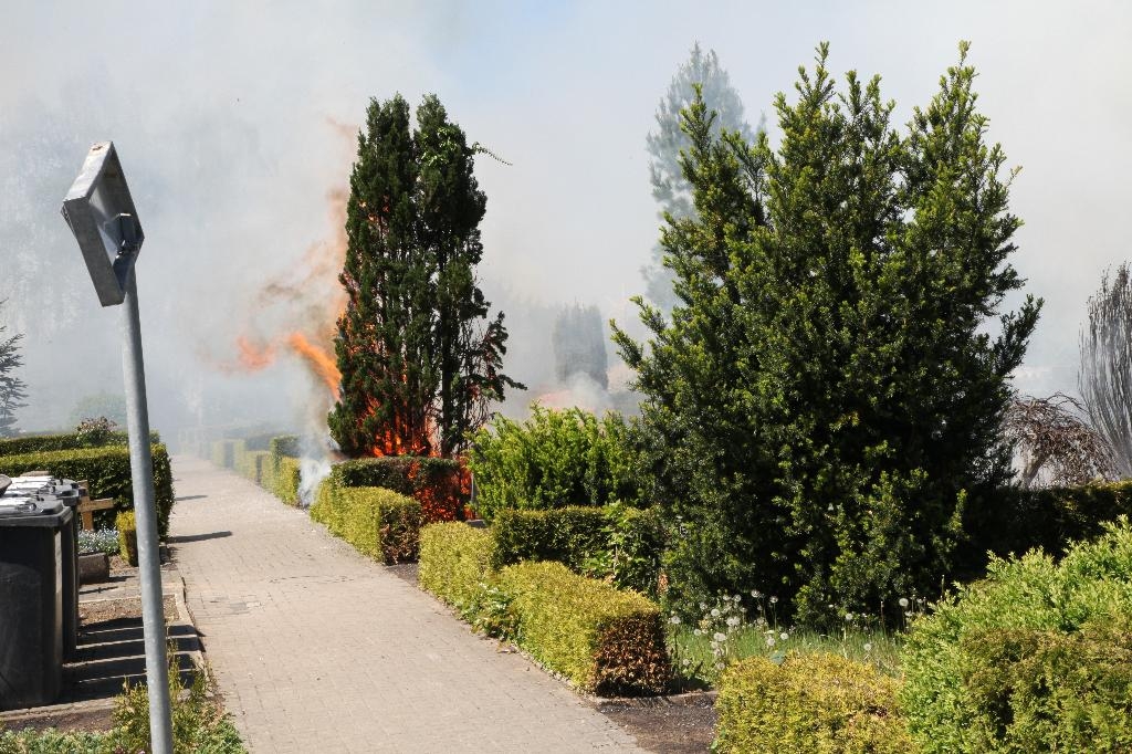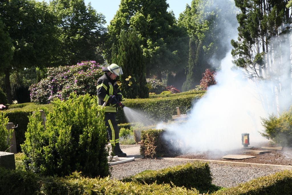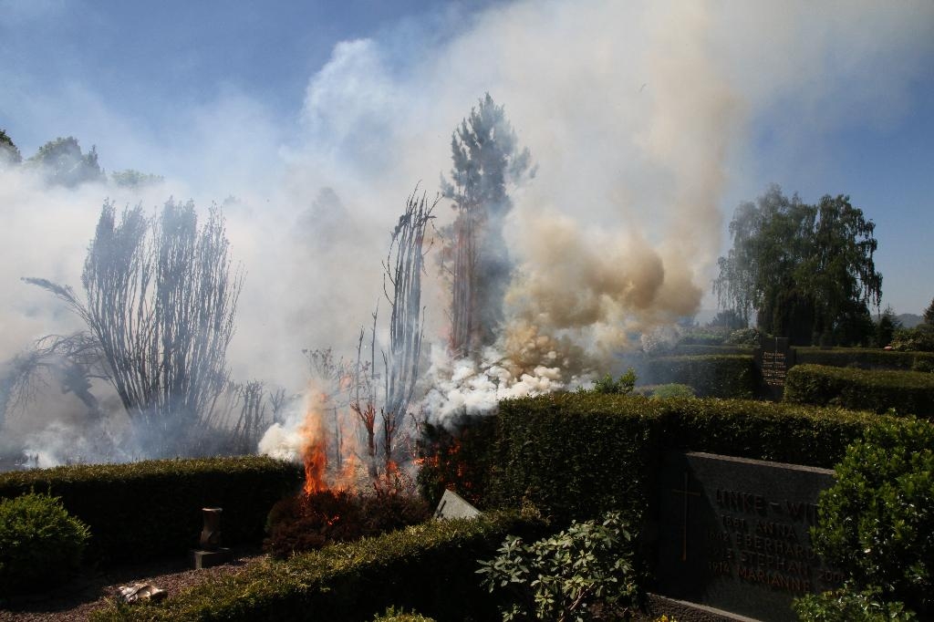 Dunkle Rauchschwaden zogen heute gegen 13,45 Uhr über Hüsten . Auf dem Friedhof St. Petri wurden Sträucher und Grabschmuck Opfer der Flammen.