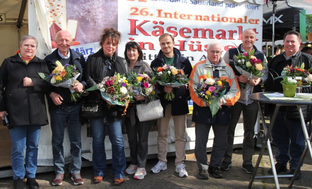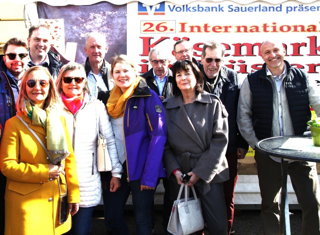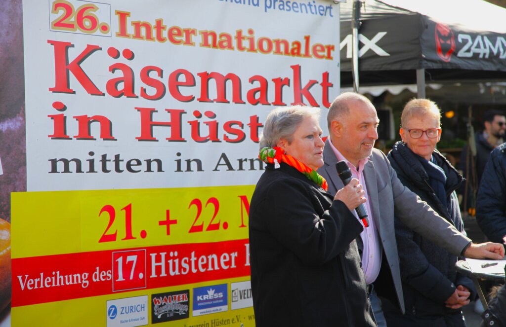 Unter dem Beifall zahlreicher Gäste und Besucher haben Bürgermeister Ralf Paul Bittner und die Vorsitzende des Verkehrs- und Gewerbevereins Hüsten, Angelika Geue, den 26. Internationalen Käsemarkt eröffnet. In seiner Ansprache lobte der Bürgermeister die reibungslose Organisation der Veranstaltung sowie das große Engagement von Angelika Geue, die bereits vor 30 Jahren zum Gründerteam gehörte. Ohne die coronabedingten Ausfälle hätte in diesem Jahr bereits der 30. Käsemarkt stattgefunden.