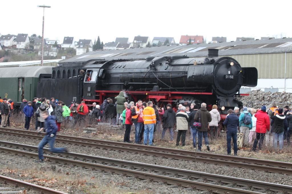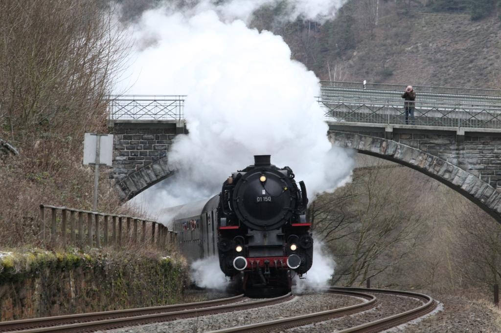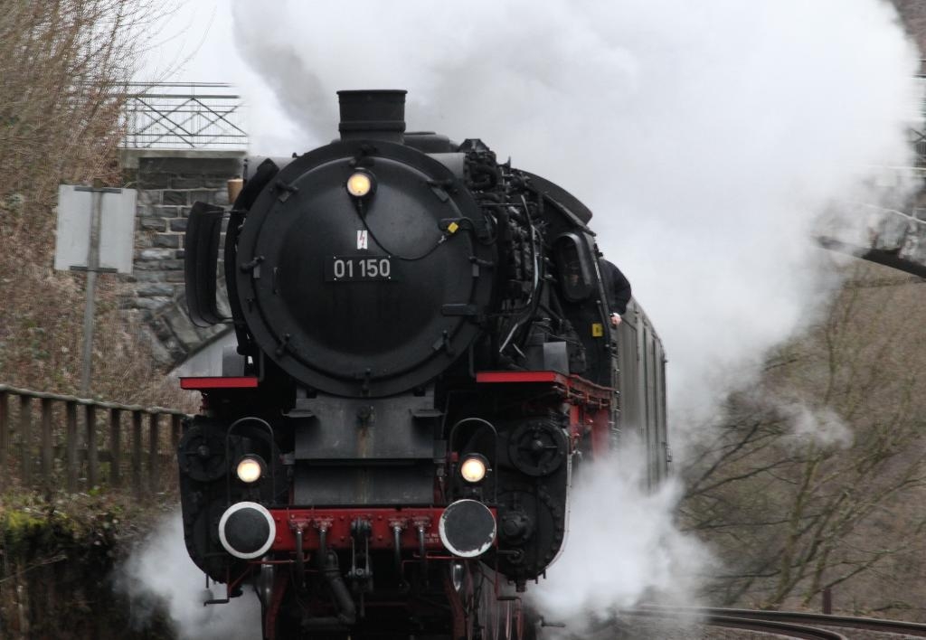 Heute Samstag den 20.Februar 2016 um 10.25 Uhr fuhr der Historische Dampfzug durch den Bahnhof Neheim – Hüsten. Gezogen wurde der Zug von einer 01-150. Die Lok wurde 1935 bei Henschel in Kassel gebaut und befeuert wird diese Lok auch heute noch mit echter Steinkohle. Heute zog diese Lok die legendären Wagen des Rheingold. In Arnsberg machte der Zug einen Halt um Wasser zu fassen und fuhr dann um 11.31 Uhr weiter Richtung Willingen. Fotos : Bahnhof Neheim -Hüsten, Bahnhof Arnsberg und in voller Fahrt beim Viadukt in Arnsberg – Rumbeck