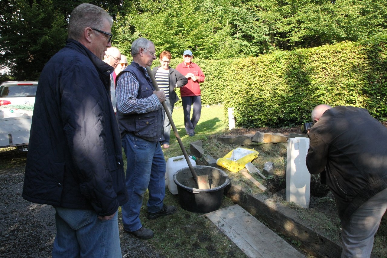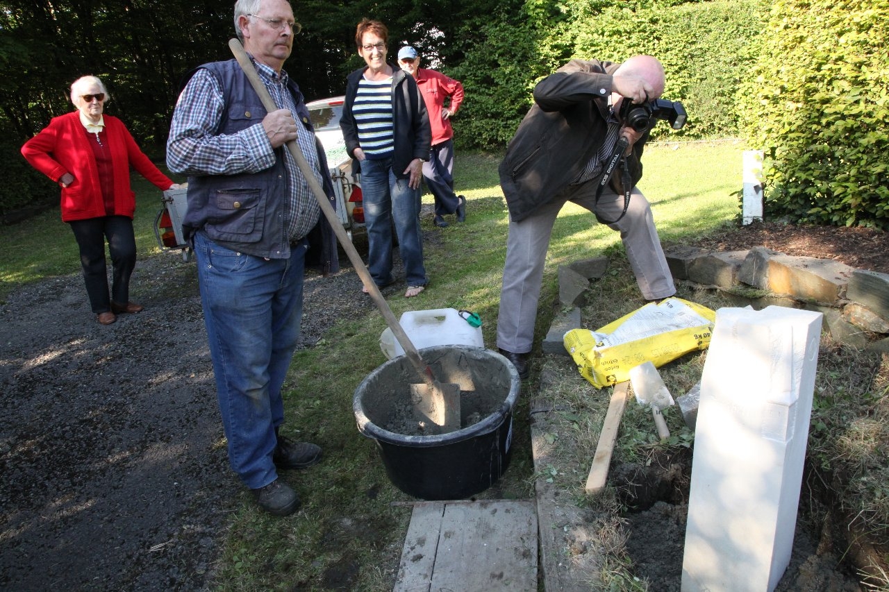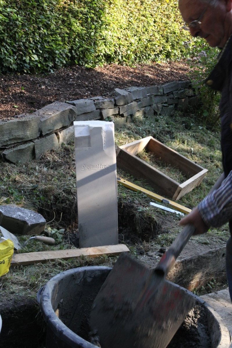 Willi Tillman, als stellvertretender Vorsitzender des Heimatkreises Freiheit Hüsten e. V., hat zusammen mit dem Vorstandes und der Künstlerin Stefanie Schröter den neuen Grenzstein in sein Betonfundament gesetzt.