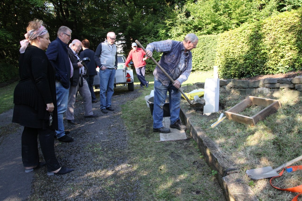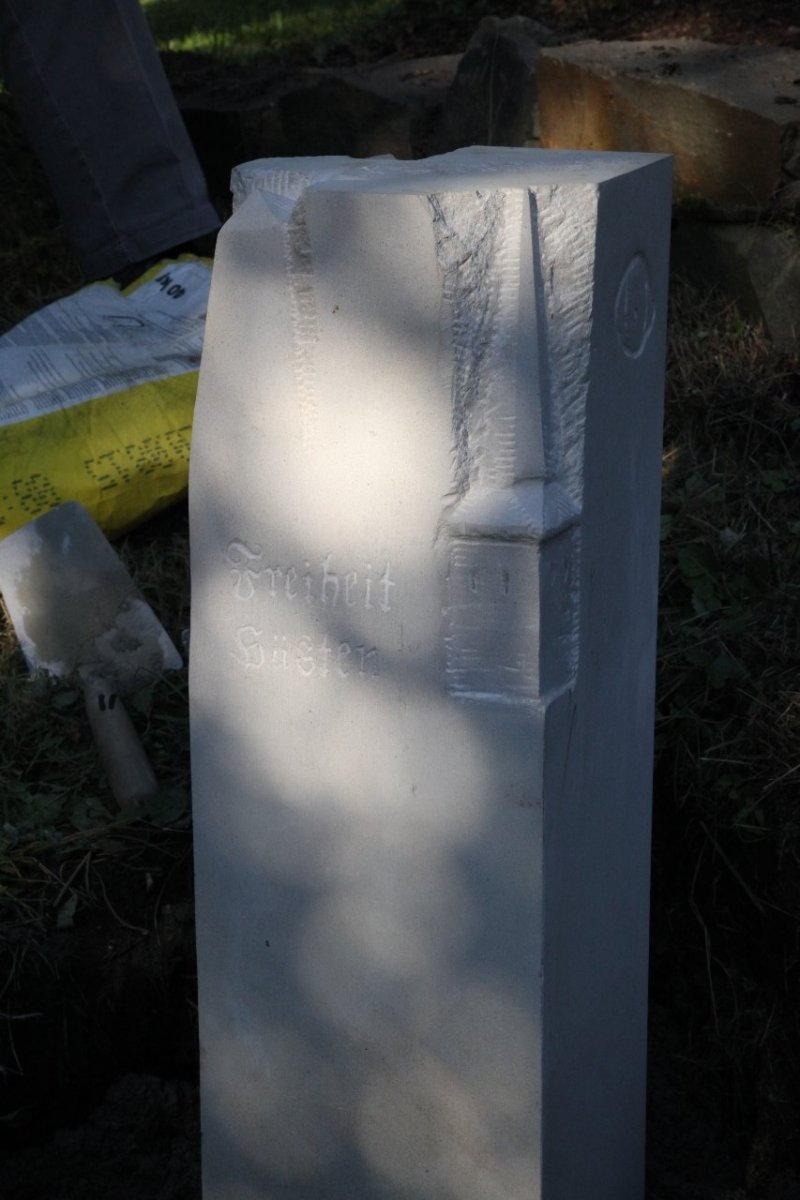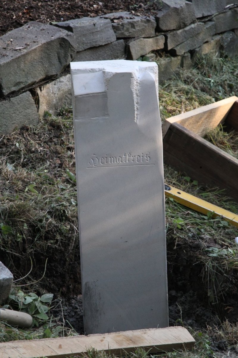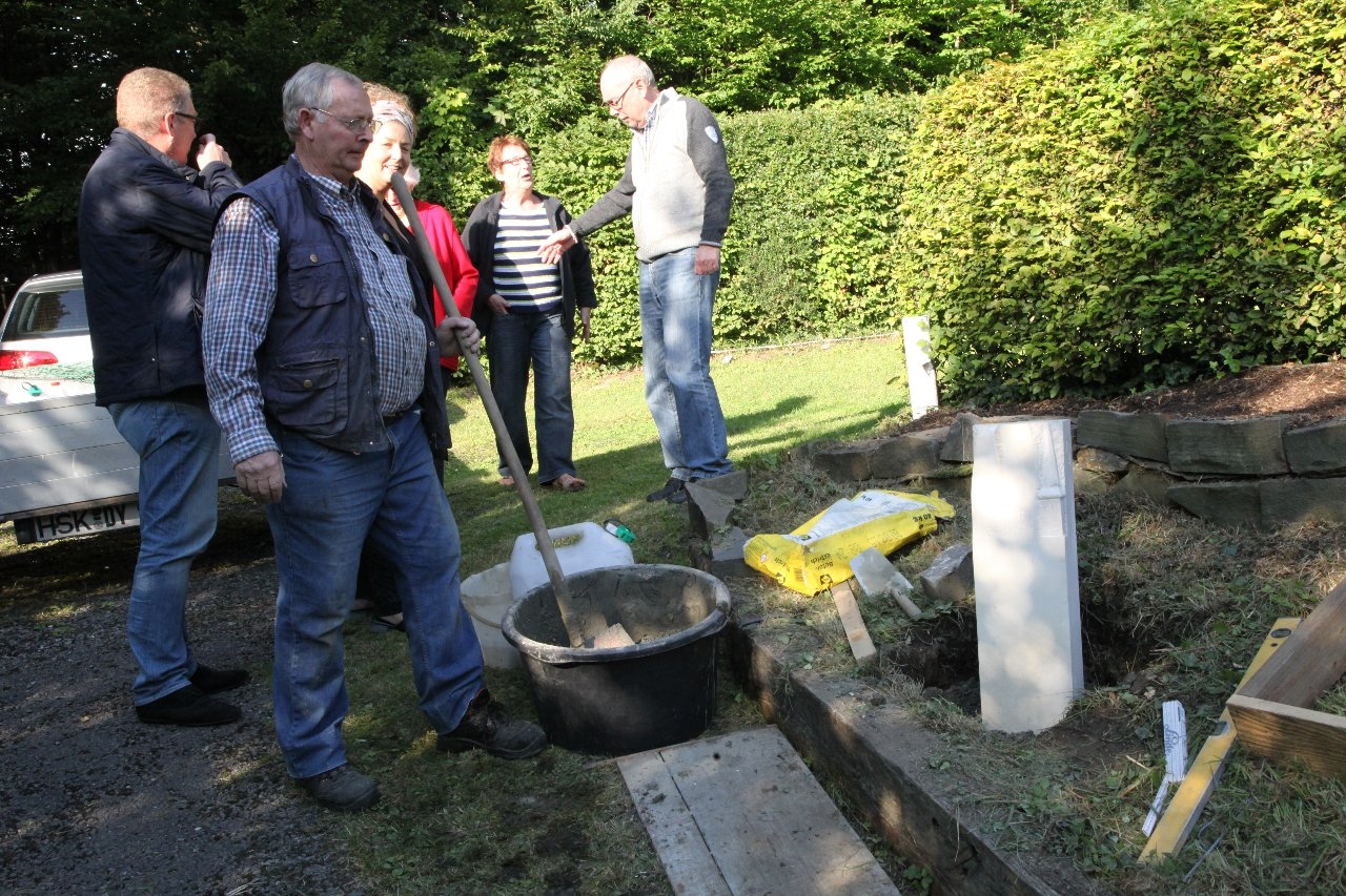 Willi Tillman, als stellvertretender Vorsitzender des Heimatkreises Freiheit Hüsten e. V., hat zusammen mit dem Vorstandes und der Künstlerin Stefanie Schröter den neuen Grenzstein in sein Betonfundament gesetzt.