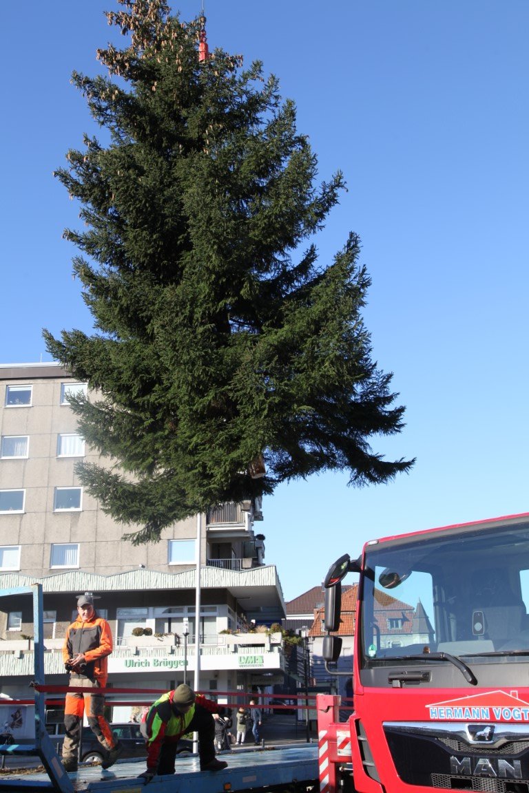 Alles hatte sehr gut funktioniert: Die 10m hohe Fichte wurde auf Bergheim problemlos gefällt und zum Hüstener Markt transportiert. Wie schon viele Jahre vorher sollte der Weihnachtsbaum vor der St. Petri-Kirche in der dafür vorgesehene Bodenhülse befestigt werden.