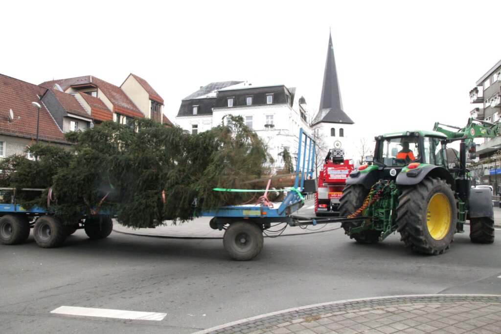 Der diesjährige Weihnachtsbaum für den Hüstener Markt ist angekommen: Ein rund 12 Meter hoher und 900 Kilogramm schwerer Baum wurde aus Bergheim nach Hüsten gebracht und steht nun vor der St.-Petri-Kirche.